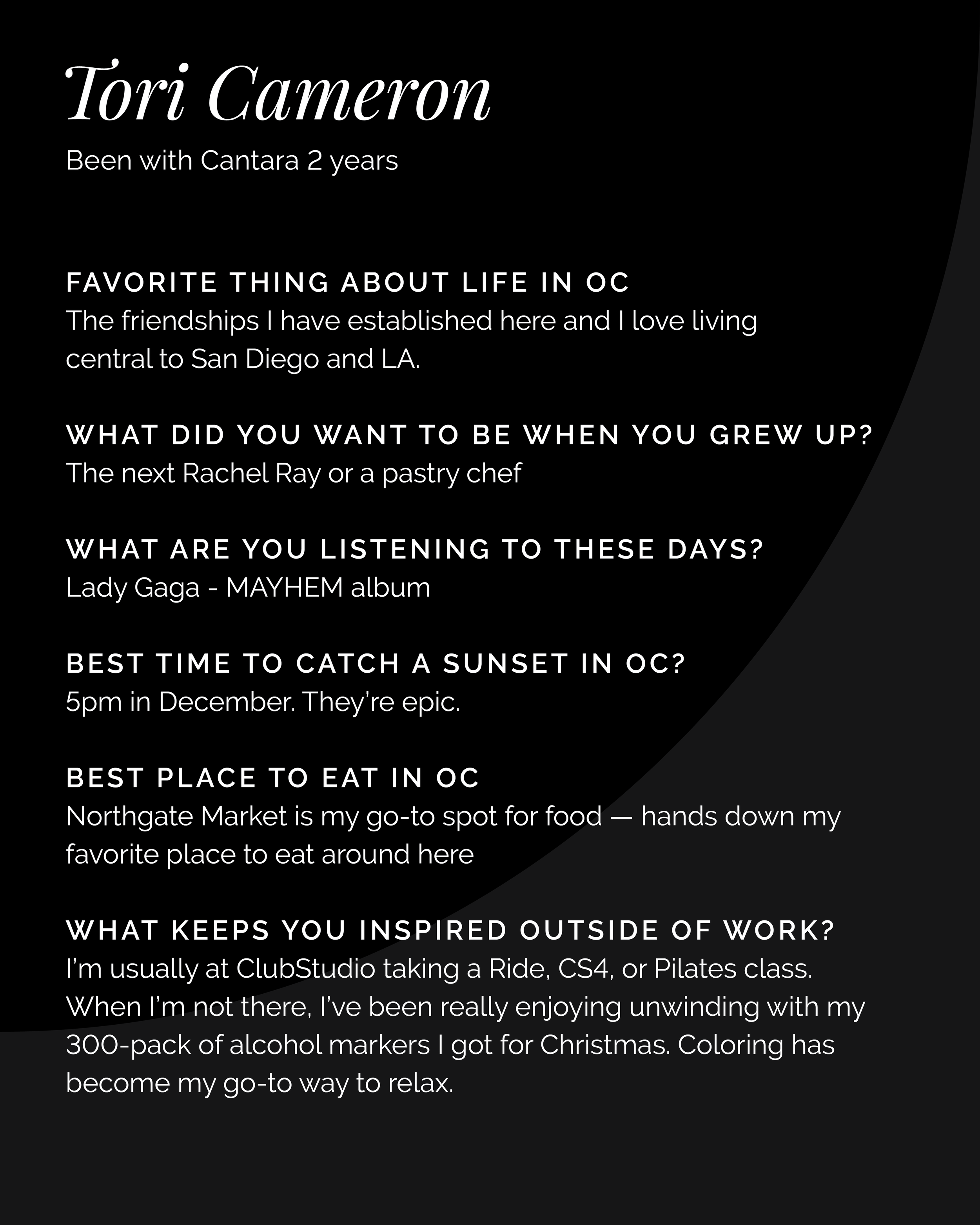 Favorite thing about Life in OC: The friendships I have established here and I love living central to San Diego and LA.